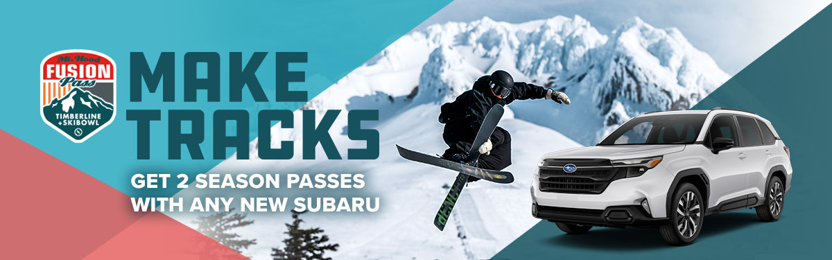Subaru wants to help you make tracks in more ways than one. Because when you buy or lease any new Subaru between November 1, 2025, and January 2, 2026, you'll get two Mt. Hood Fusion passes, unlimited season passes valid at both Timberline and Mt. Hood Skibowl.